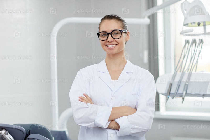Молодая женщина-стоматолог позирует в офисе