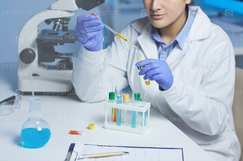 Близкий план опытной женщины-химика фармакологической клиники, сидящей за столом и сбрасывающей желтую жидкость в пробирку во время проведения исследований