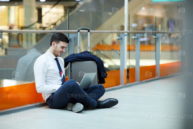 Веселый красивый молодой бизнес-менеджер в формальной одежде, сидящий с перекрещенными ногами на полу в аэропорту и использующий ноутбук во время подготовки к презентации
