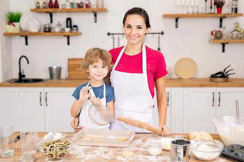 Милый улыбающийся мальчик с просеивателем и его мать со штифтом стоят у стола