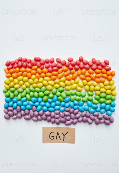 Красочный флаг является символом свободы для геев: многоцветные сладкие бобы, выложенные в форме флага равенства и небольшой планшет с словом 'гей'