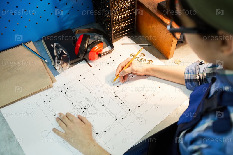 Вид сверху занятого инженера, стоящего за столом и рисующего на эскизе во время проектирования плана дома
