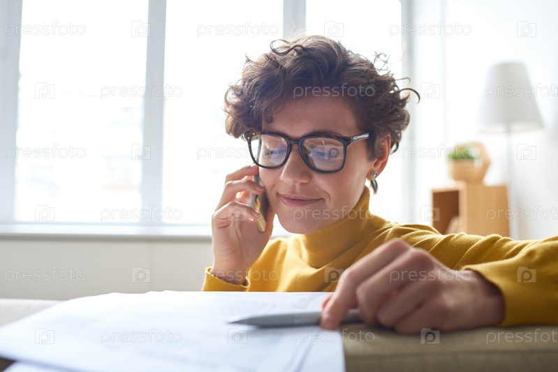 Удовлетворенная женщина задает вопрос по телефону во время заполнения документов