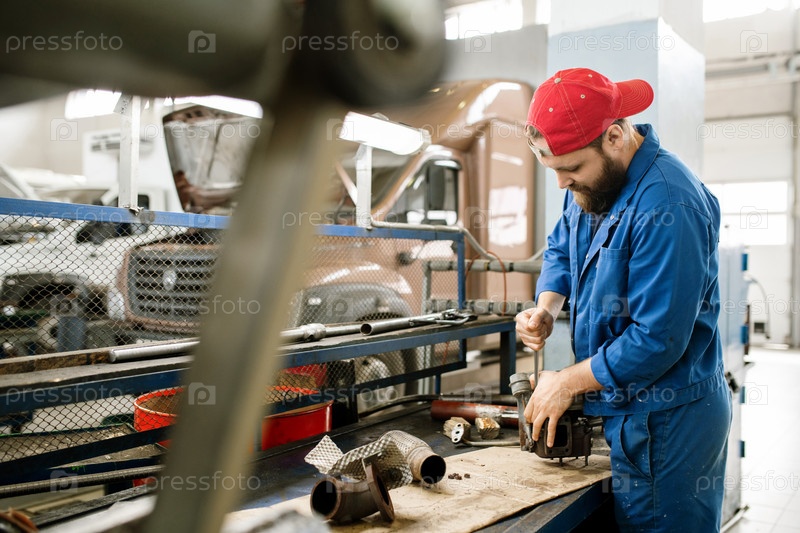 Молодой бородатый механик в рабочей одежде ремонтирует часть автомобильного двигателя