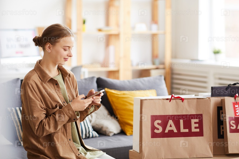 Молодая женщина в непринужденной рубашке сидит на диване в комнате с сумками для покупок на столе и использует смартфон при покупке контента с онлайн-сайта