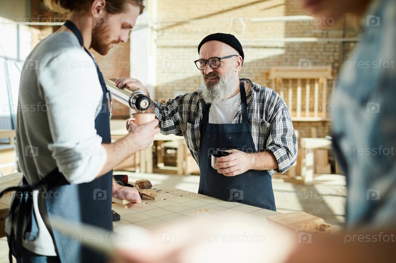 Содержимое осторожного старшего плотника в шляпе и фартуке, стоящего за столом и наливающего горячий чай коллеге на мастерской во время короткого перерыва