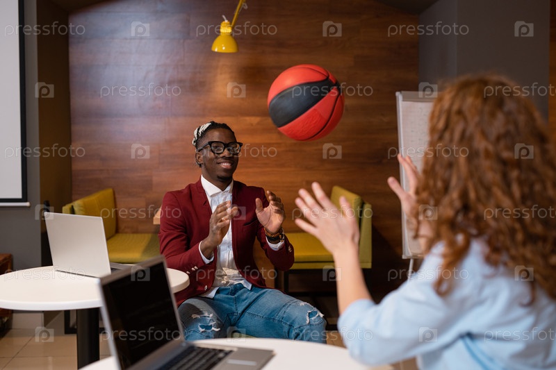 Счастливый африканский парень в умном casual, бросающий мяч своему товарищу по группе