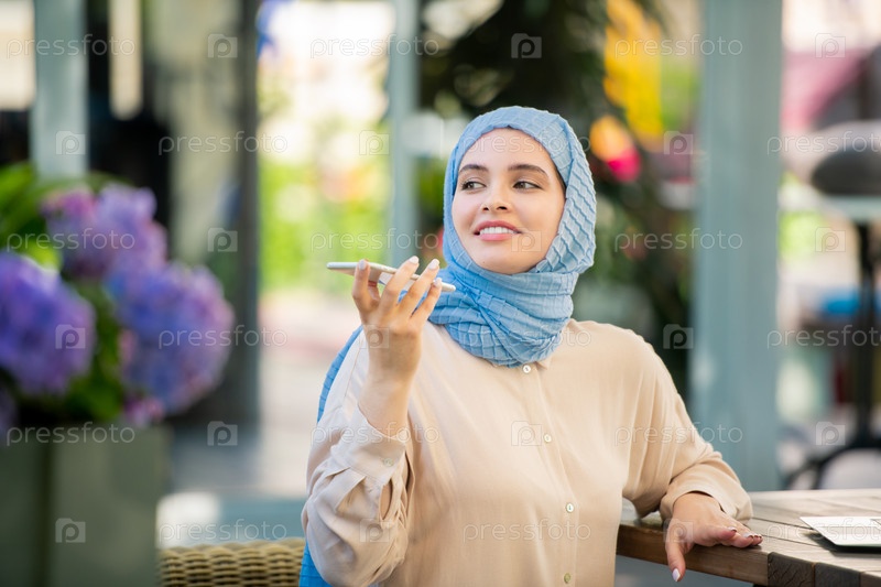 Счастливая молодая женщина записывает голосовое сообщение в городской среде