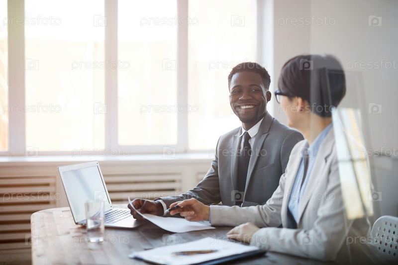 Улыбающиеся деловые люди, работающие в офисе