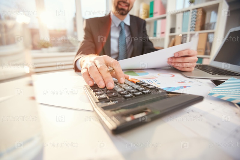 Улыбающийся бизнесмен рассчитывает финансы Close up