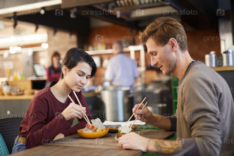Пара наслаждается азиатской едой в кафе