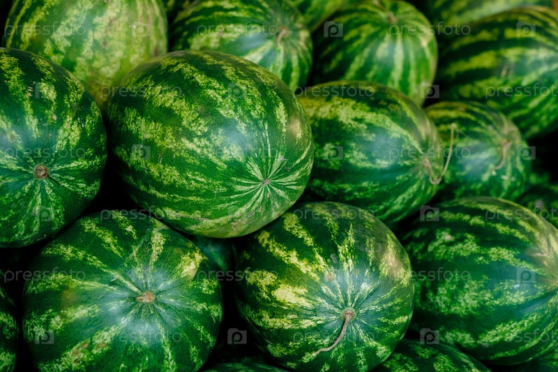 Большая группа больших зеленых арбузов в супермаркете делает кучу