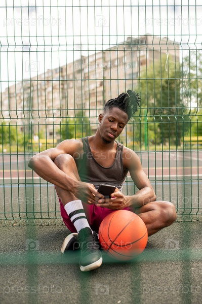 Спокойный африканский парень в спортивной одежде прокручивает или отправляет сообщения на смартфоне