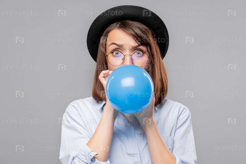 Брюнетка в шляпе и очках дует на голубой воздушный шар для вечеринки