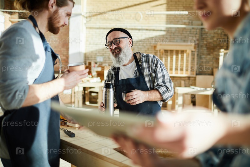 Позитивные старшие и молодые плотники в фартуках, стоящие за столом и пьющие горячий травяной чай во время перерыва на столярном семинаре