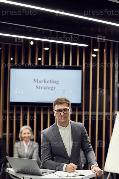 Портрет контента Красивый молодой маркетолог в очках, стоящий за столом для выступлений с щитом и ноутбуком на бизнес-форуме