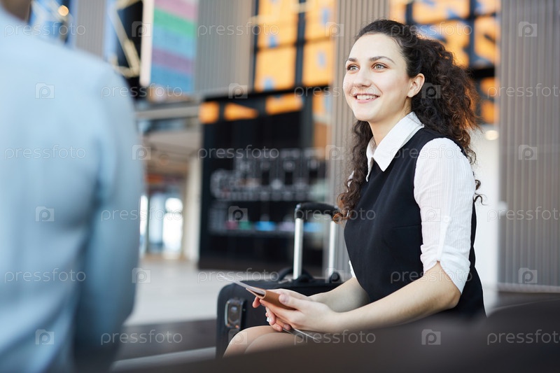 Улыбающаяся молодая женщина ждет в аэропорту