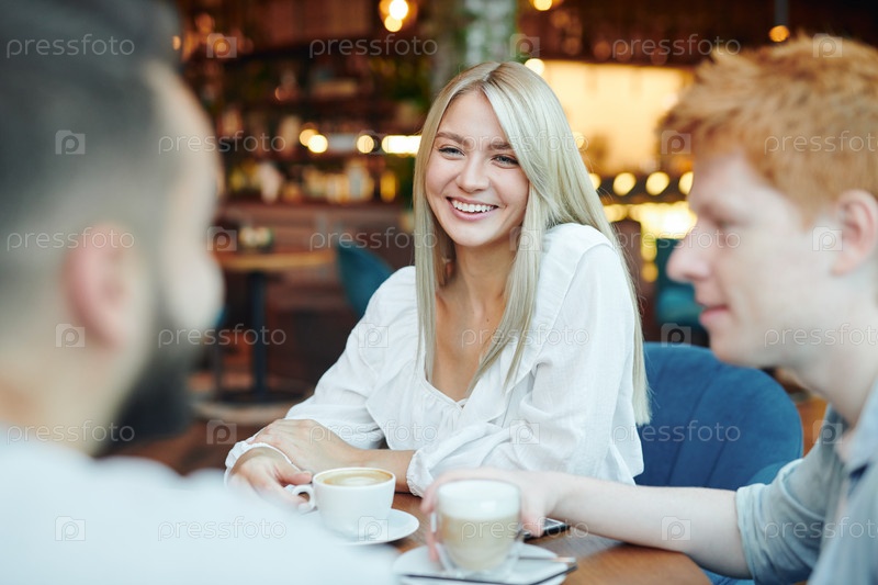 Счастливая блондинка с зубчатой улыбкой, пьющая чашку капучино с двумя парнями