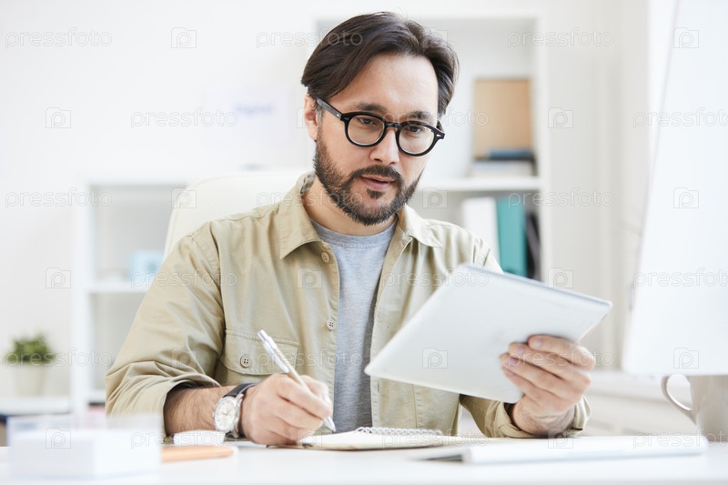 Серьезно занятый молодой азиатский мужчина с бородой, сидящий за столом и использующий цифровой планшет во время проведения анализа рынка