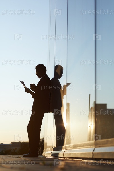 Силуэт молодого бизнесмена, занятого с документами, опирающегося на здание на открытом воздухе и пьющий кофе во время изучения документов