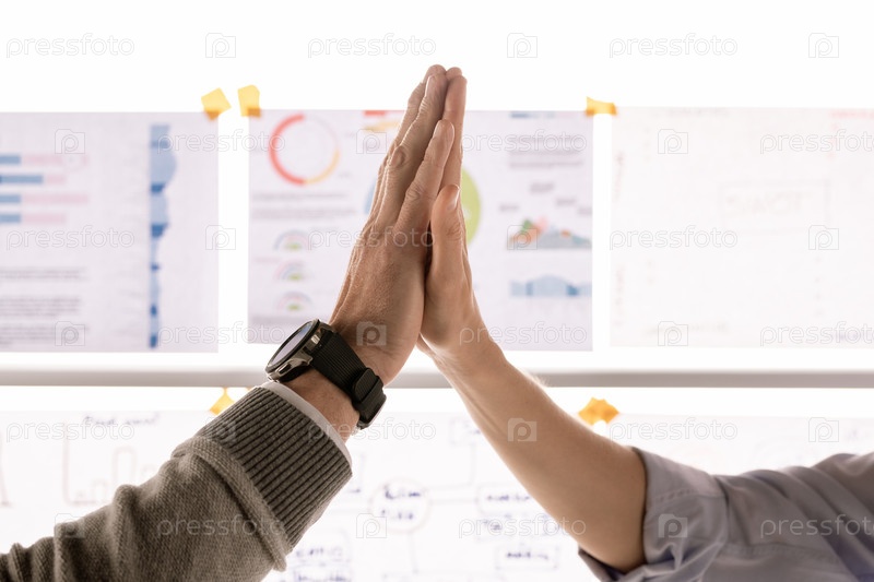 Руки двух успешных партнеров в жесте высокой пятерки после заключения соглашения