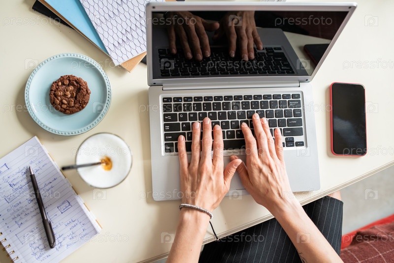 Обзор человеческих рук на клавиатуре ноутбука во время сети по столу