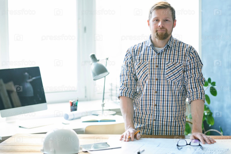 Контент уверенный красивый бородатый бригадир в обычной рубашке, стоящий за столом и смотрящий на камеру во время анализа технического эскиза