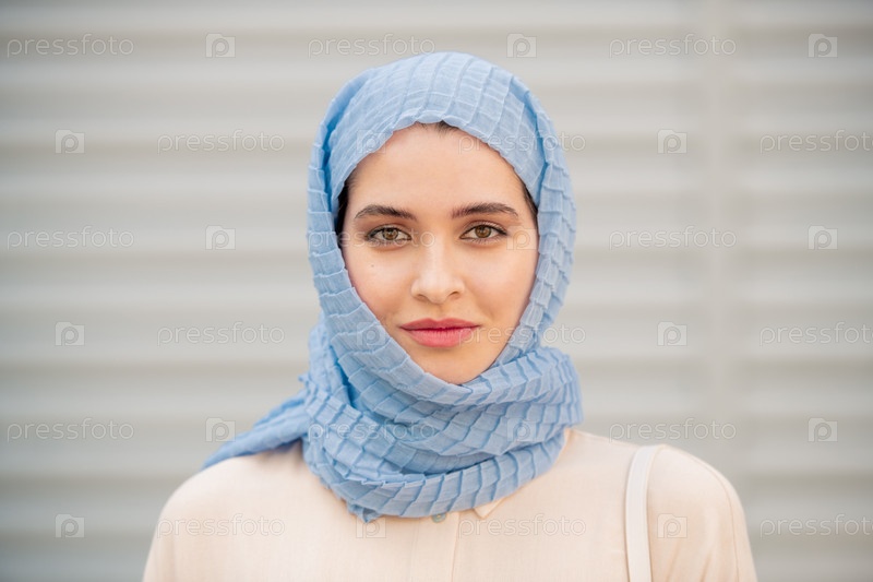 Молодая спокойная женщина в синем хиджабе смотрит на тебя
