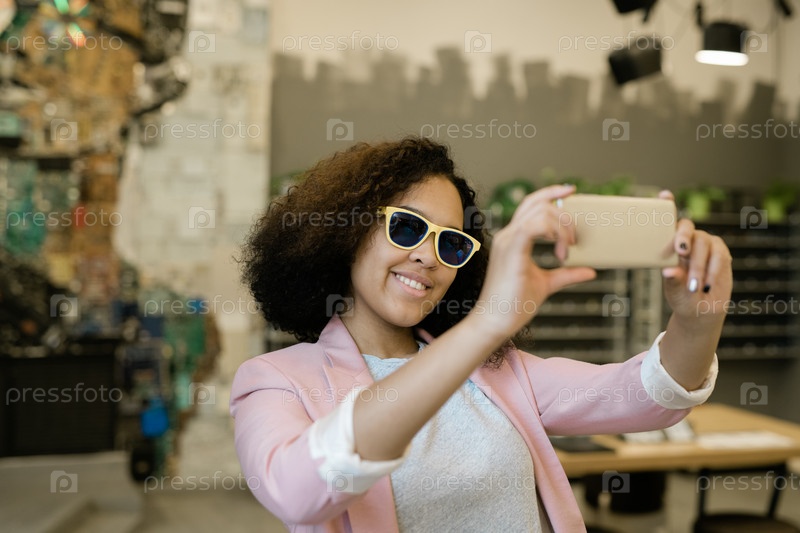 Красивая молодая женщина смешанной расы в солнцезащитных очках смотрит на камеру смартфона