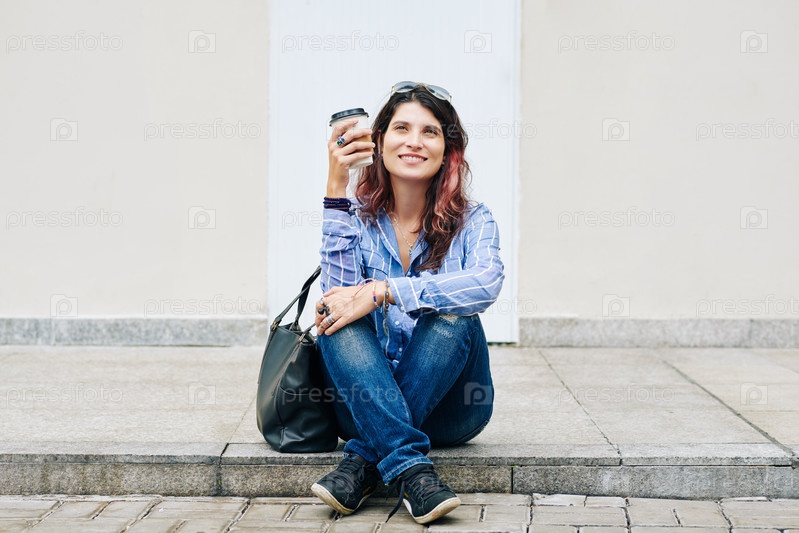 Женщина, отдыхающая на тротуаре