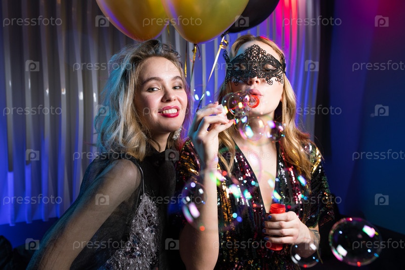 Одна из двух красивых девушек дует мыльные пузыри с ее подругой, стоящей рядом
