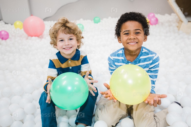 Милые веселые межкультурные мальчишки в полосатых рубашках, играющие с шариками
