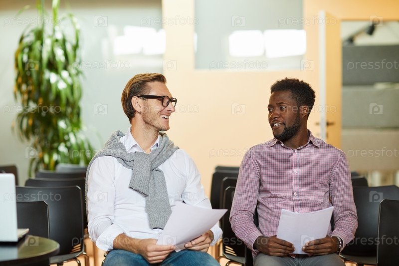 Улыбающиеся молодые мультиэтнические специалисты сидят на стульях в аудитории и делятся идеями маркетинговой стратегии
