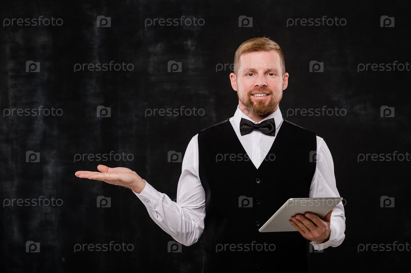 Счастливый молодой бородатый официант с цифровым планшетом, показывающим вам, куда идти