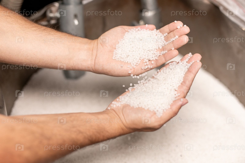 Человеческие руки держат две кучи белых полимерных гранул