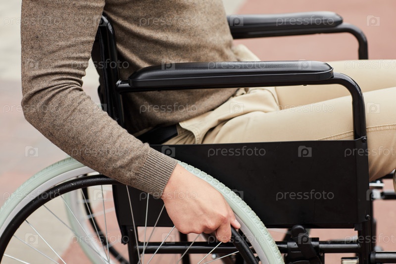 Близкий план неузнаваемого инвалида в коричневом свитере, сидящего на современной коляске и поворачивающего перила