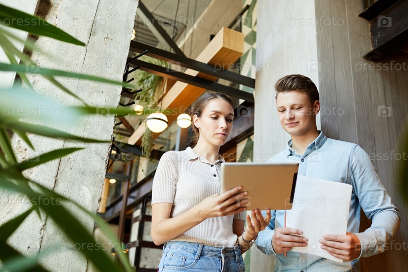 Ниже представлен контент мыслящей молодой пары, стоящей в лобби чердака и просматривающей веб-сайт на планшете