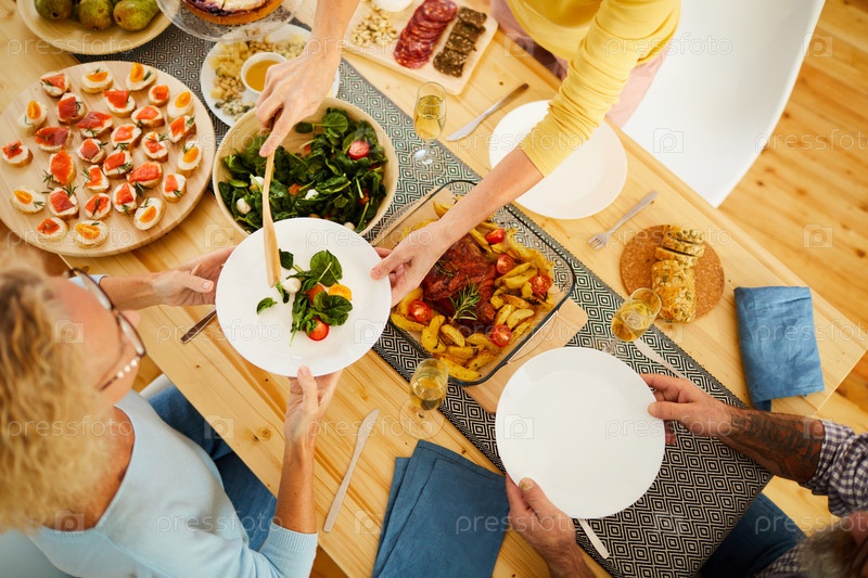 Дама кладет салат на тарелки гостей