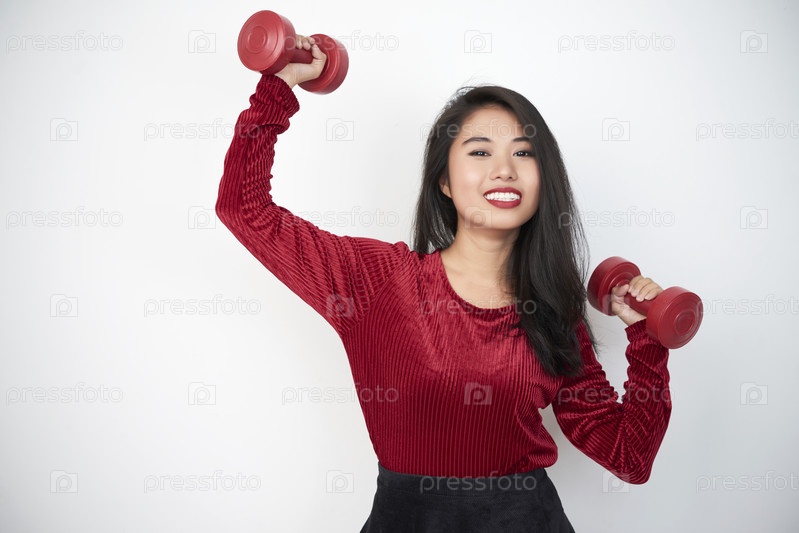Женщина занимается упражнениями на гантели