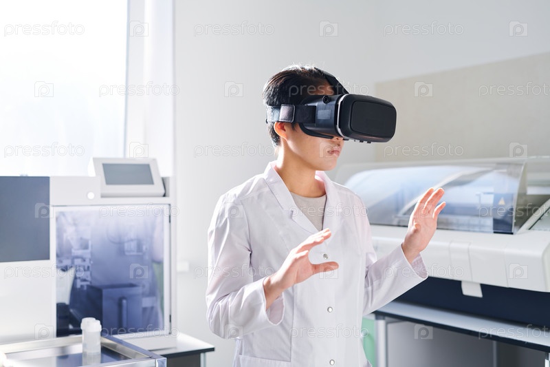 Молодой лабораторный ученый в симуляторе VR