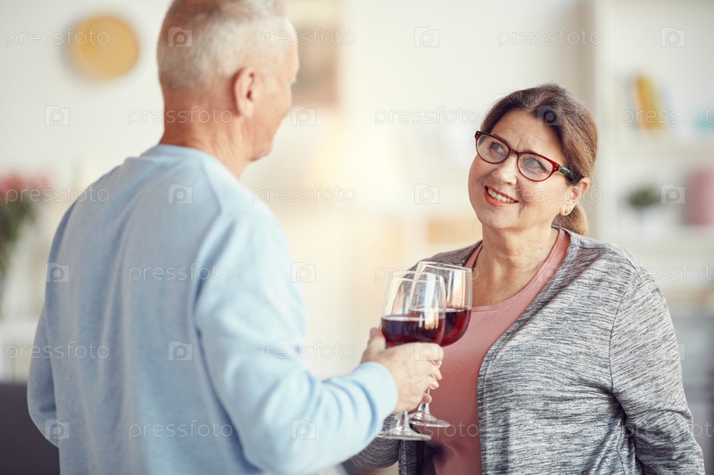 Позитивная старшая пара в повседневной одежде стоит в гостиной и тостирует с винными бокалами, отмечая годовщину