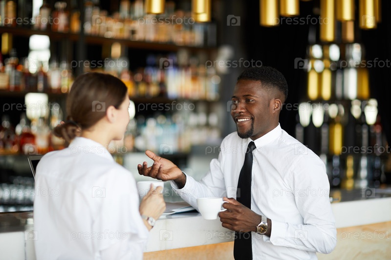 Веселые молодые мультиэтнические бизнесмены в белых рубашках, опирающиеся на стойку бара и болтающие во время перерыва за кофе
