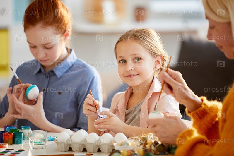 Милая девочка рисует яйца на Пасху