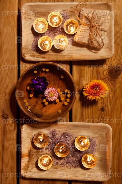Высокоугольный взгляд на кноллинг композиция горящих ароматических свечей на деревянных тарелках, голова цветка плавает над водой в миске