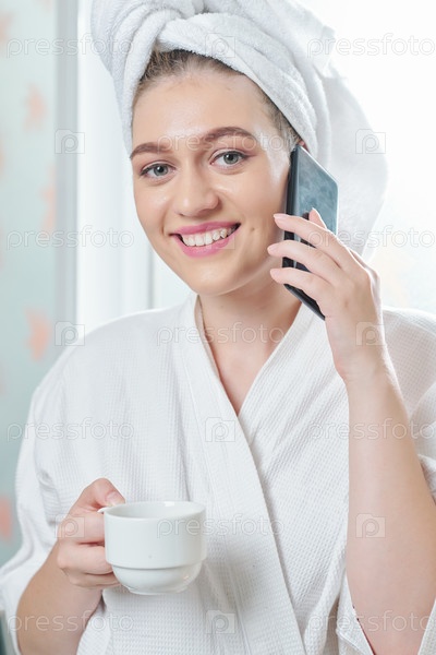 Красивая женщина звонит после того, как приняла душ