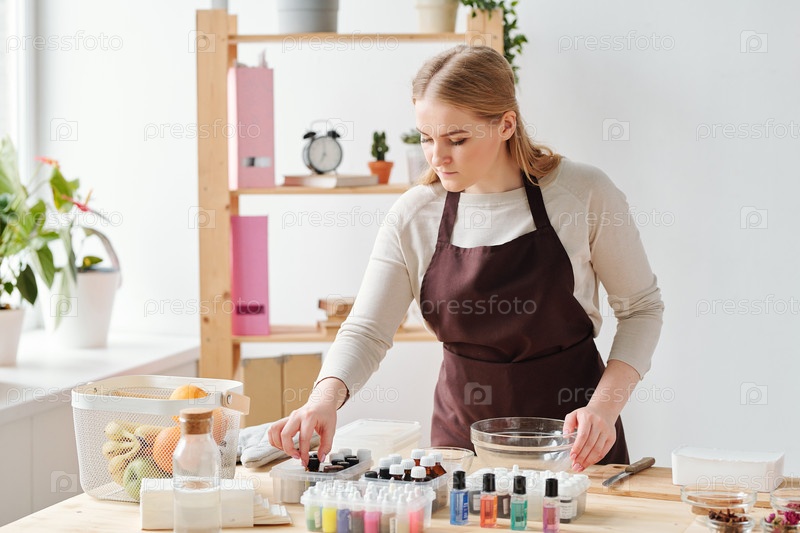 Молодая блондинка-ремесленница в фартуке, выбирающая аромат для ручного мыла