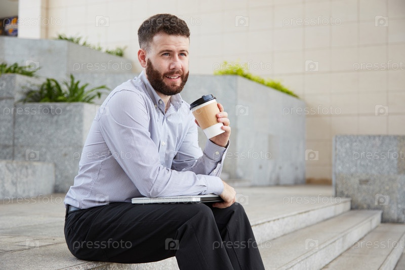 Бизнесмен проводит кофе-брейк на свежем воздухе
