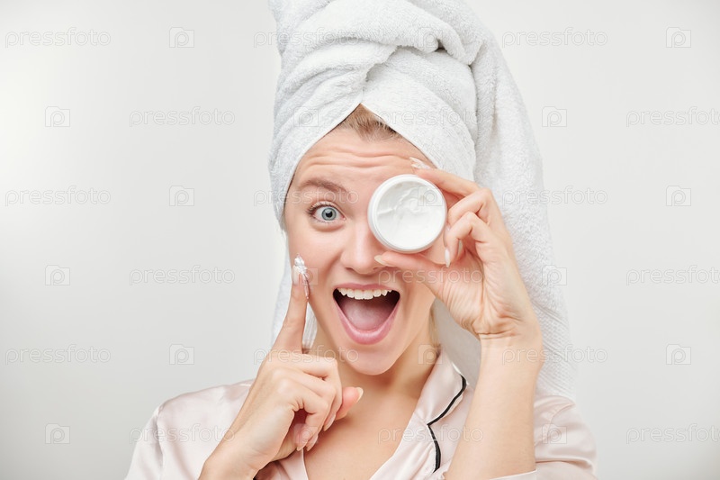 Взволнованная девушка с полотенцем на голове держит банку с увлажняющим кремом для лица под глазами