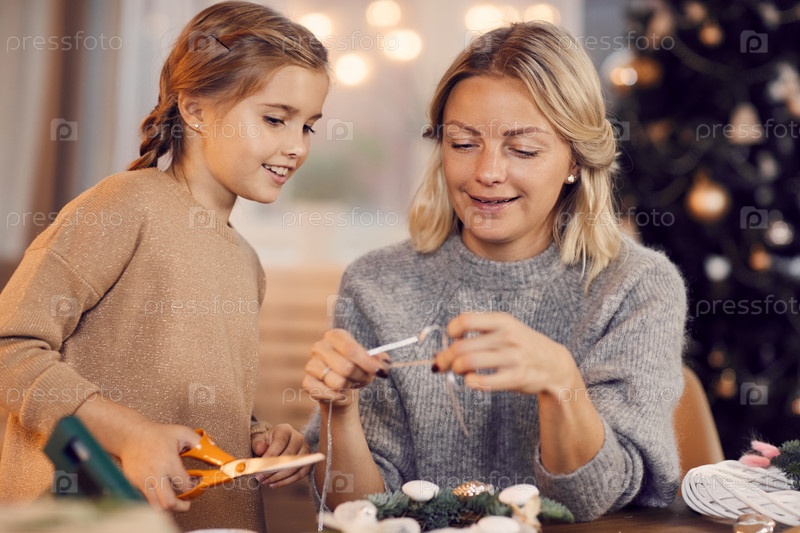 Счастливая молодая семья в теплых свитерах работает над рождественским венком как команда в гостиной: мать измеряет ленту, ее дочь режет её