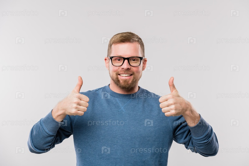 Молодой веселый бизнесмен в синем пуловере, показывающий большие пальцы в одиночестве